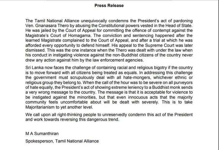 බොදු බල සේනා මහලේකම් ගලගොඩ අත්තේ ඥානසාර හිමියන්ට ජනපති සමාව ලබාදීමට ගත් තීරණයට ද්රවිඩ ජාතික සන්ධානය විරෝධය දක්වා තිබේ. එහි මාධ්ය ප්රකාශක පාර්ලිමේන්තු මන්ත්රී එම්.ඒ. සුමන්තිරන් මහතා නිවේදනයක් නිකුත් කරමින් පවසන්නේ ඥානසාර හිමියන්ට ජනපති සමාව දීමට ගත් තරණය හරහා වැරදි පණිවිඩියක් රටට ලබාදී ඇති බවයි.