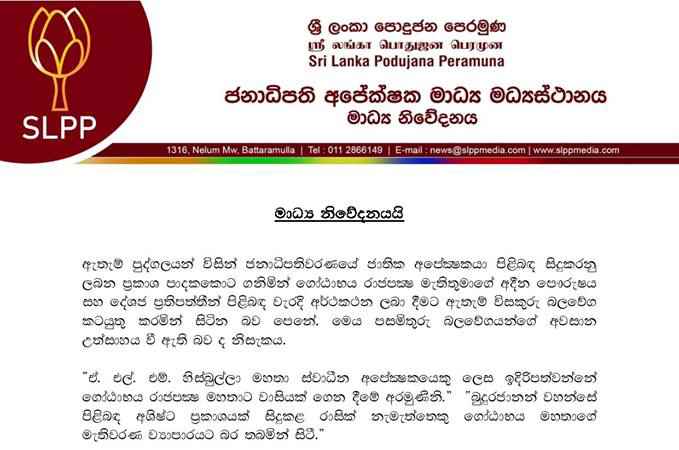 “ඇතැම් පුද්ගලයන් විසින් ජනාධිපතිවරණයේ ජාතික අපේක්‍ෂකයා පිළිබ`ද සිදුකරනු ලබන ප‍්‍රකාශ පාදකකොට ගනිමින් ගෝඨාභය රාජපක්‍ෂ මැතිතුමාගේ අදීන පෞරුෂය සහ දේශජ ප‍්‍රතිපත්තීන් පිළිබ`ද වැරදි අර්ථකථන ලබා දීමට ඇතැම් විසකුරු බලවේග කටයුතු කරමින් සිටින බව පෙනේ. මෙය පසමිතුරු බලවේගයන්ගේ අවසාන උත්සාහය වී ඇති බවද නිසැකය.