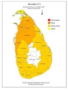 දිස්ත්රික් 5කට අද දිනයේත් සෙල්සියස් අංශක 41-54 දක්වා අධික ලෙස උෂ්ණත්වය ඉහළ යා හැකි බවත් එය අනතුරුදායක මට්ටමක් බවත් කාලගුණ විද්යා දෙපාර්තමේන්තුව අනතුරු අඟවා තිබේ.
