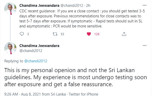 මීට පෙර කොරෝනා පරීක්ෂණයකට ලක්විය යුතු කාලසීමාව ලෙස දක්වා තිබුණේ දින 5 -7ත් අතර කාලයක් ලෙස දක්වා තිබුනද මේ වනවිට එය වෙනස්වී ඇති බවද සිය ට්විටර් ගිණුමේ සටහනක් තබමින් ආචාර්ය චන්දිම ජීවන්දර සඳහන් කර ඇත .