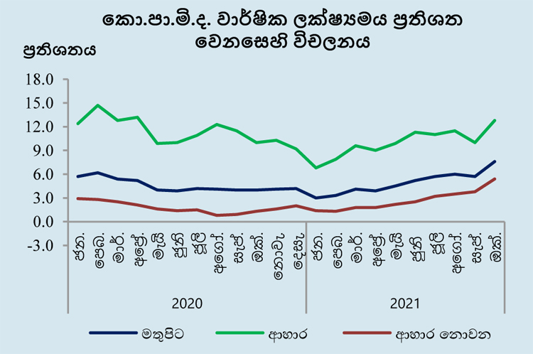 කොළඹ පාරිභෝගික මිල දර්ශකයෙහි (කො.පා.මි.ද., 2013=100) වාර්ෂික ලක්ෂ්යමය වෙනස මගින් මනිනු ලබන මතුපිට උද්ධමනය, 2021 සැප්තැම්බර් මාසයේ පැවති සියයට 5.7හි සිට 2021 ඔක්තෝබර් මාසයේ දී සියයට 7.6 දක්වා ඉහළ ගියේය.