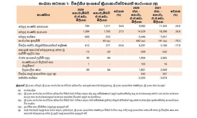 වෙළෙඳ ගිණුමේ හිඟය, 2020 වසරේ නොවැම්බර් මාසයේ දී වාර්තා වූ එක්සත් ජනපද ඩොලර් මිලියන 600ට සාපේක්ෂව 2021 වසරේ නොවැම්බර් මාසයේ දී එක්සත් ජනපද ඩොලර් මිලියන 553 ක් දක්වා අඩුවිය.