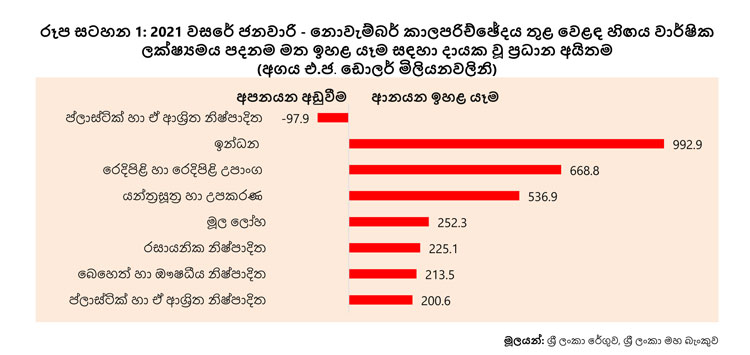 මේ අතර 2021 වසරේ ජනවාරි සිට නොවැම්බර් දක්වා කාලය තුළ වෙළෙඳ ගිණුමේ සමස්ත හිඟය, 2020 වසරේ අනුරූප කාලපරිච්ඡේදය තුළ වාර්තා වූ එක්සත් ජනපද ඩොලර් මිලියන 5,446ක හිඟයට සාපේක්ෂව එක්සත් ජනපද ඩොලර් මිලියන 7,051ක් දක්වා පුළුල් විය.