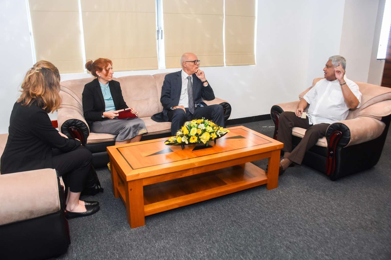 ඒ ශ්රී ලංකාවේ ස්විස්ටර්ලන්ත තානාපති ඩොමිනික් ෆර්ග්ලර් සහ මහජන ආරක්ෂක ඇමති ටිරාන් අලස් මහත්වරුන් අතර මහජන ආරක්ෂක අමාත්යාංශයේ පැවති සුහද හමුවකදීය.