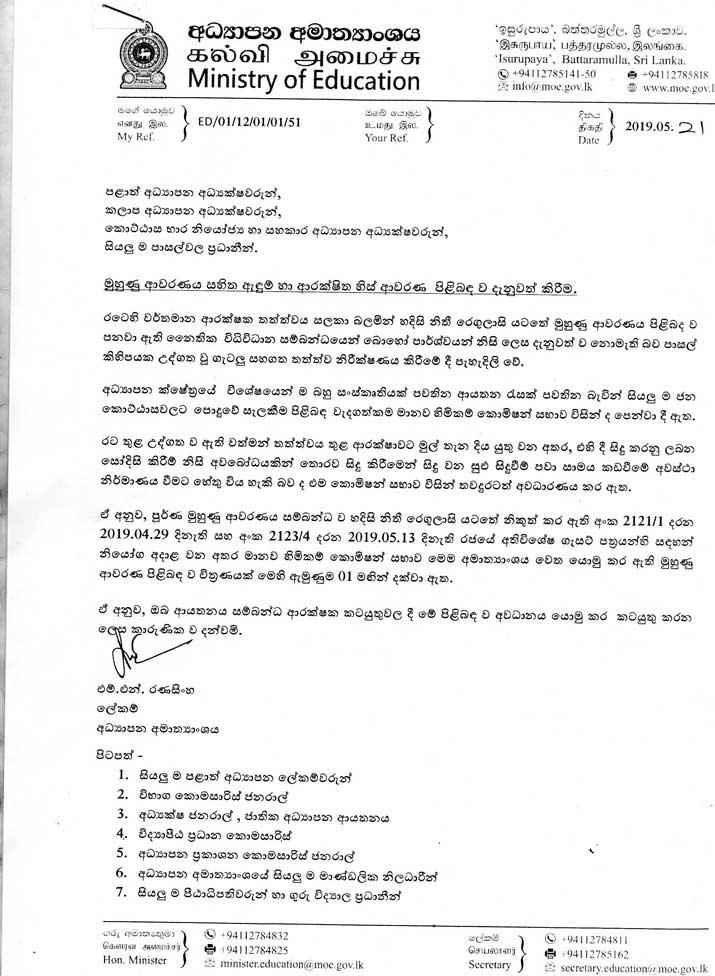පූර්ණ මුහුණු ආවරණ සම්බන්ධව හදිසි නීති රෙගුලාසි යටතේ නිකුත් කර ඇති රජයේ අති විශේෂ ගැසට් නිවේදනයන් හි දැක්වෙන නියෝගයට අනුකූලව සහ මානව හිමිකම් කොමිෂන් සභාව මුහුණු ආවරණය පිළිබඳව අධ්යාපන අමාත්යාංශයට යොමු කර ඇති චිත්රණයක් ද සහිතව අධ්යාපන අමාත්යවරයාගේ උපදෙස් පරිදි එම විශේෂ ලිපිය අධ්යාපන ලේකම්වරයා පාසල් ප්රධානීන්ට යොමු කොට තිබෙනවා.”