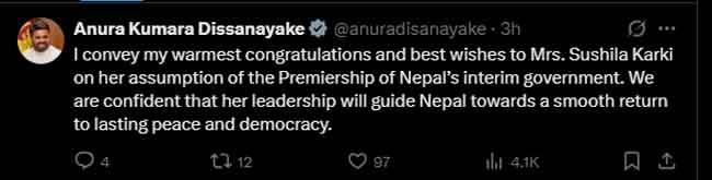 සිය X ගිණුමේ සටහනක් තබමින් ජනාධිපති අනුර කුමාර දිසානායක මහතා එහි සඳහන් කර ඇත්තේ ඇගේ නායකත්වයෙන් නේපාලයේ ස්ථීර සාමය සහ ප්රජාතන්ත්රවාදය නැවත ස්ථාපිත කිරීමට හැකිවනු ඇතැයි තමන් විශ්වාස කරන බවය.