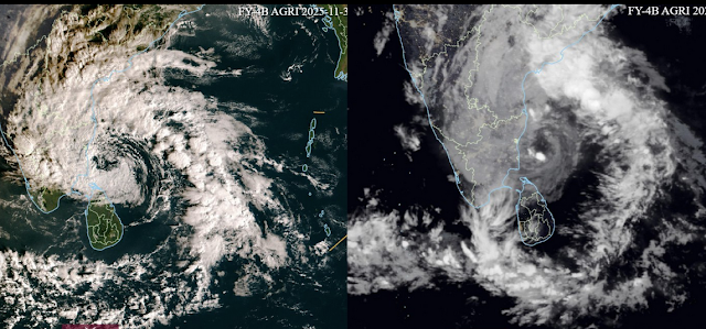 පහත පෙන්වා ඇත්තේ , චීනයේ FY-4B චන්ද්රිකාවෙන් ලබා ගන්න ලද ශ්රී ලංකාව අශ්රිත, බෙංගාල බොක්ක මුහුදු ප්රදේශයේ නවතම චායාරූපය දෙකකි. ශ්රී ලංකාවට ඉතා දරුණු බලපෑමක් ඇති කර දිවයිනෙන් ඉවතට ගමන් කරමින් පවතින “දිට්වා” [Ditwah] සුළිකුණාටුව, මේ වන විට ගැඹුරු පීඩන අවපාතයක් දක්වා දුර්වල වී, කන්කසන්තුරය සිට 240 km ක් ඊසාන දෙසින්, අක්ෂාංශ 11.7°N සහ දේශාංශ 80.6°E ආසන්නයේ කේන්ද්රගතව වී ඇත. මෙම පද්ධතිය සමග පවතින වලාකුළු වල වර්ධනය ක්රමයෙන් දුර්වල වී ඇත බව චායාරූපයේ නිරීක්ෂණය කල හැක. මේ වන විට ශ්රී ලංකාවේ ගොඩ බිම් ප්රදේශයේ කාලගුණය කෙරෙහි මෙම පද්ධතියේ ඍජු බලපෑමක් නොමැත. එනම් මෙම පද්ධතියේ බලපෑමෙන් තවදුරටත් ශ්රී ලංකාවට වර්ෂාව ඇති නොවේ. කෙසේ වෙතත් තද සුළං තත්ත්වයේ බලපෑම හේතුවෙන් ත්රිකුණාමලය සිට කන්කසන්තුරය හරහා මන්නාරම දක්වා වන මුහුදු ප්රදේශවල තවදුරටත් ධීවර සහ නාවුක කටයුතුවලින් වැළකී සිටින කරන ලද දැනුම් දීම තවදුරටත් වලංගු වේ. ශ්රී ලංකාව වටා වන සෙසු මුහුදු ප්රදේශවල ධීවර සහ නාවුක කටයුතු වල යෙදීම වළක්වමින් නිකුත් කල අනතුරු ඇඟවීම ඉවත් කර ඇත.